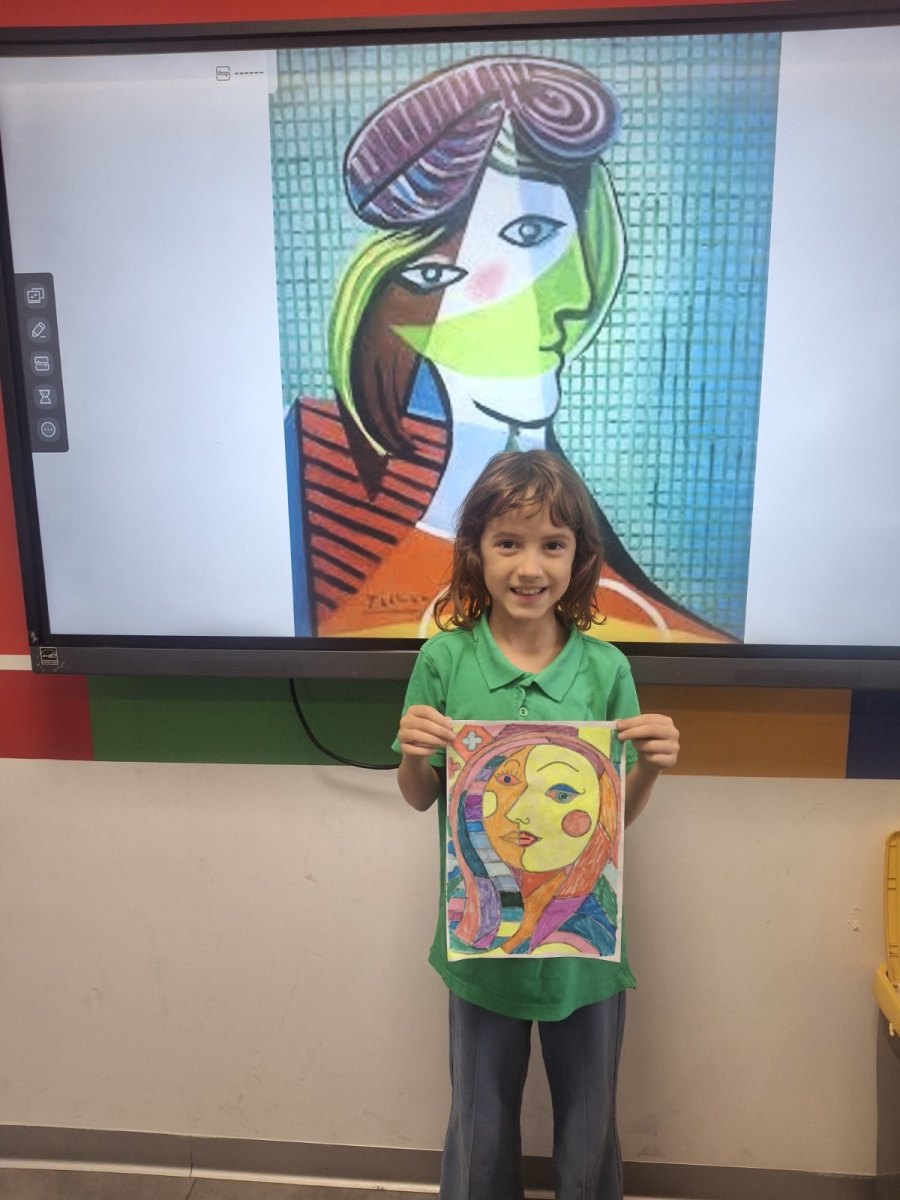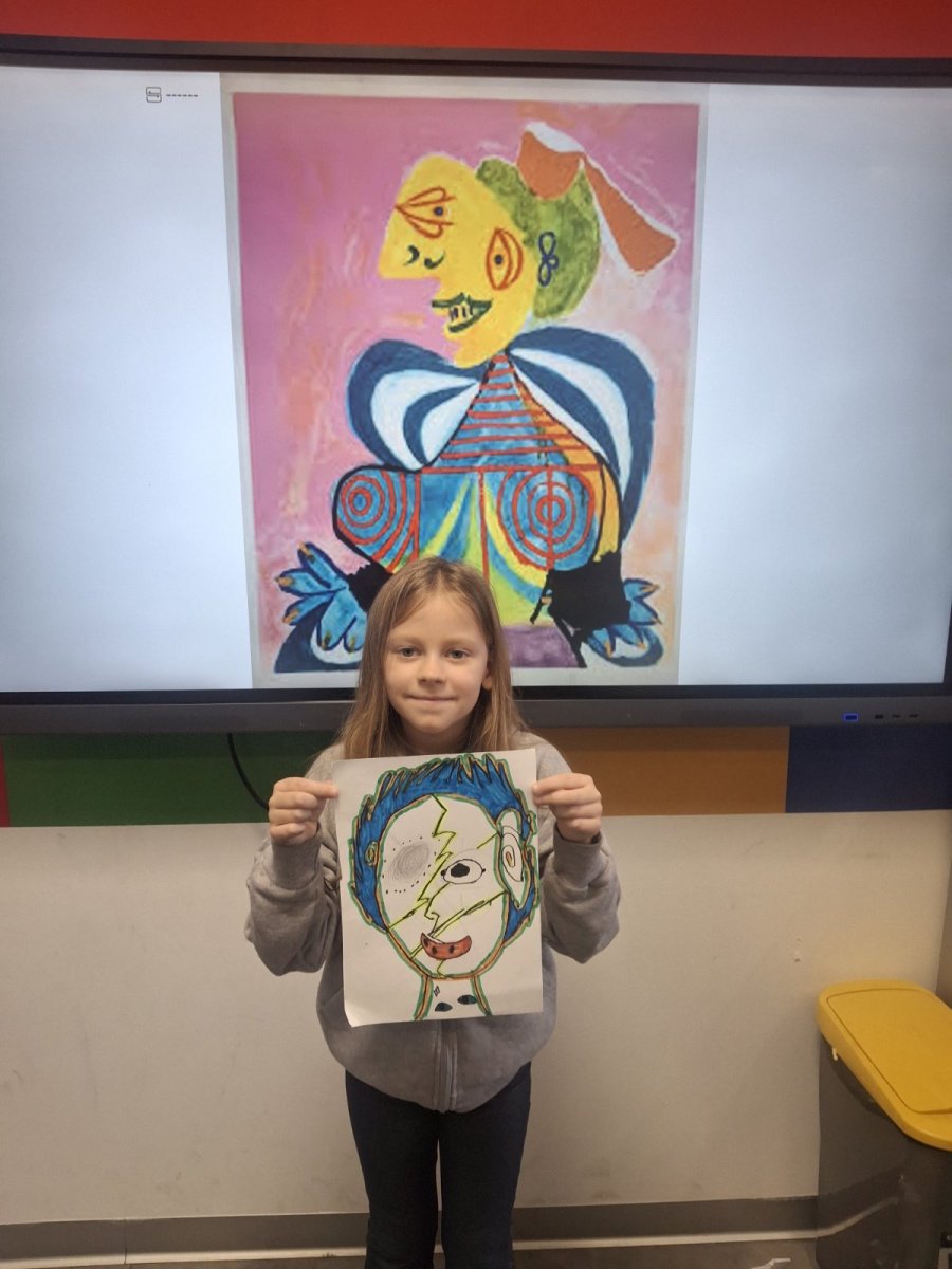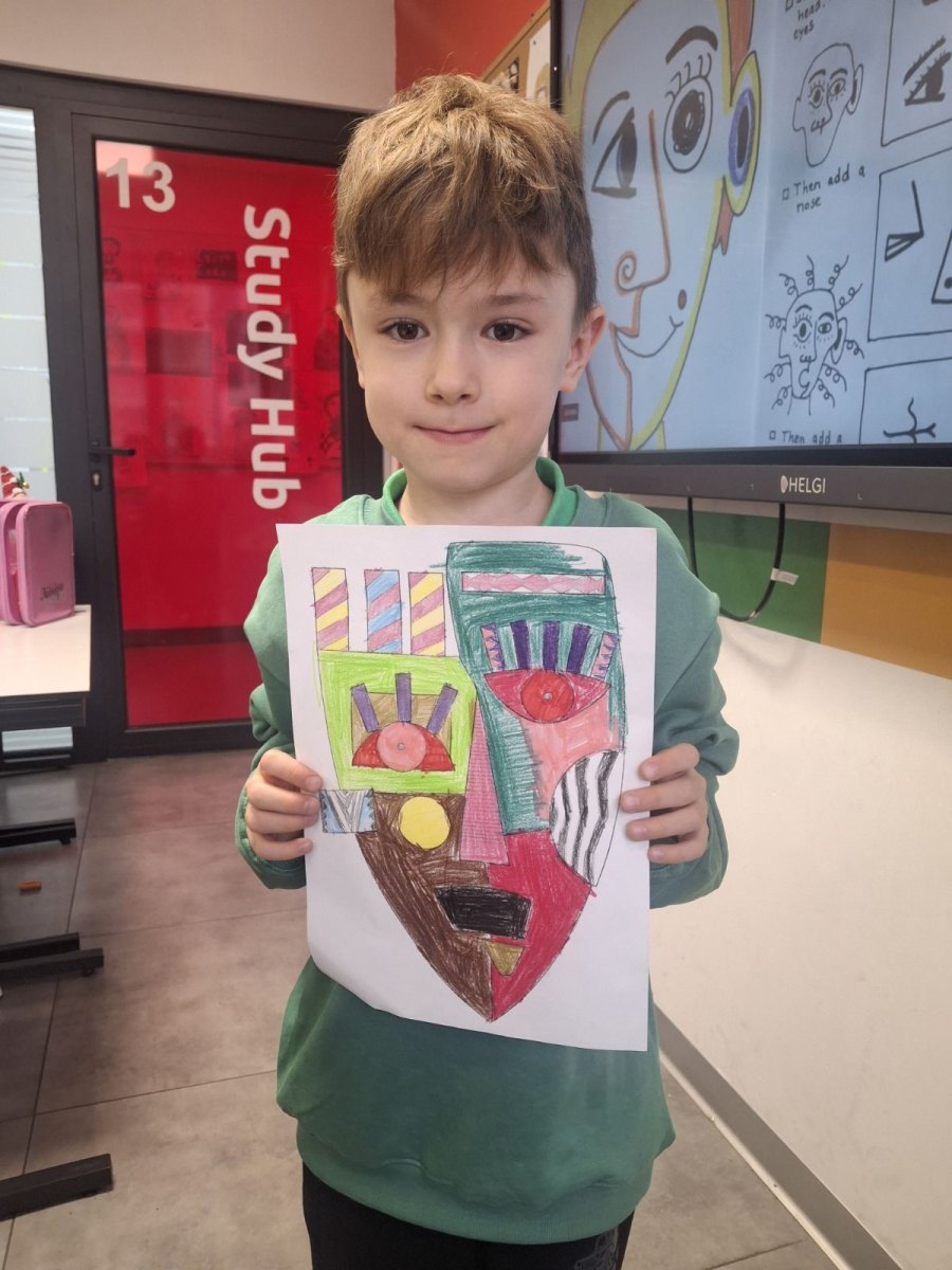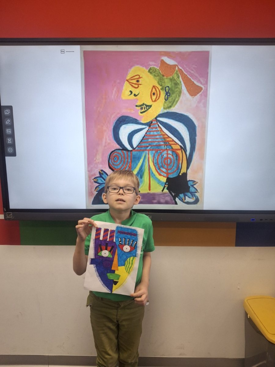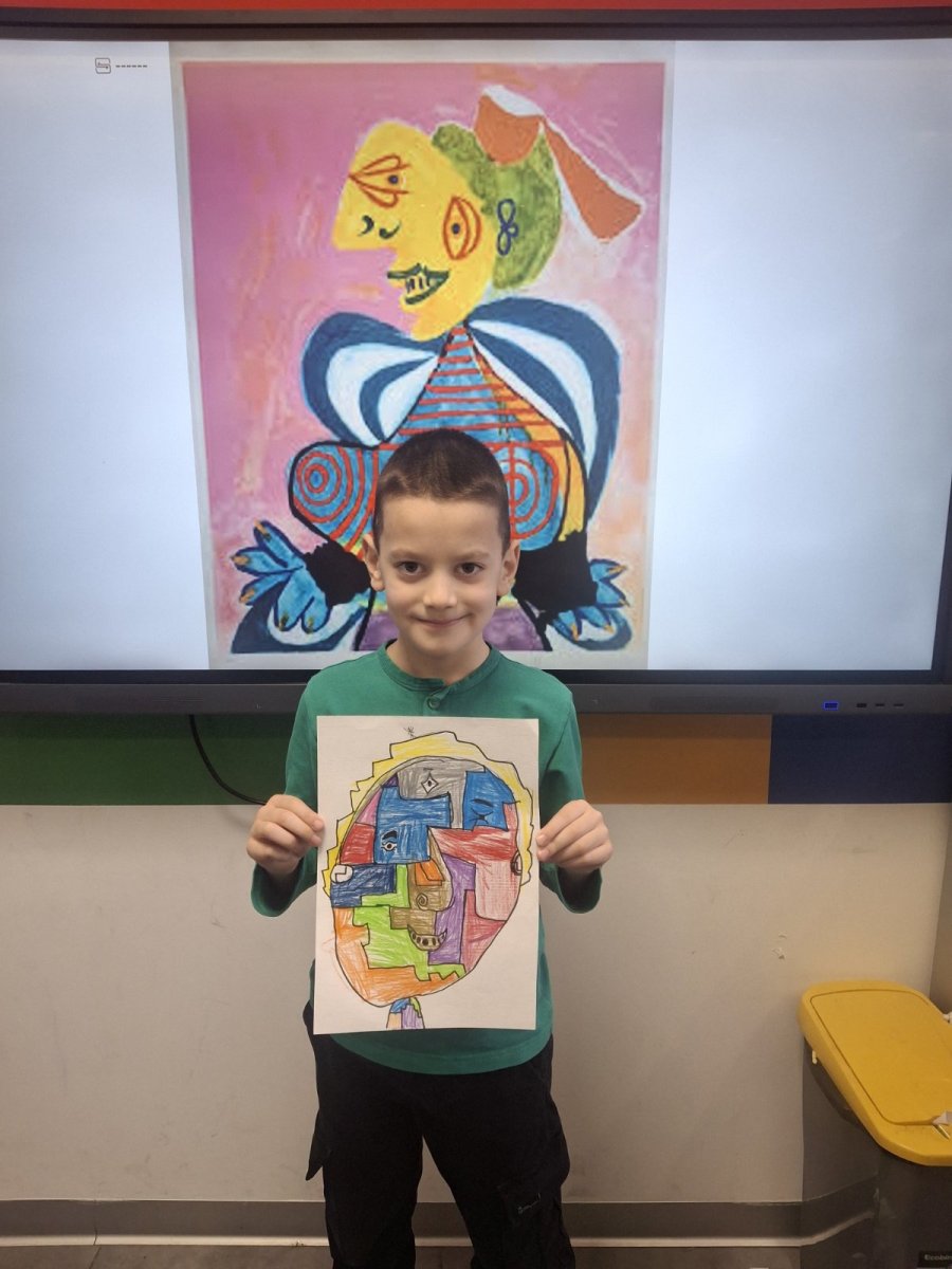 Before reaching for colors and markers, conversation was key. What makes cubism recognizable? How does Picasso break down a face into fragments, then reassemble it in a new, unexpected way? How do color, line, and form together create character? Students observed reproductions of works, asked questions, exchanged impressions. And they understood something important – that art begins with the freedom to see the world differently.