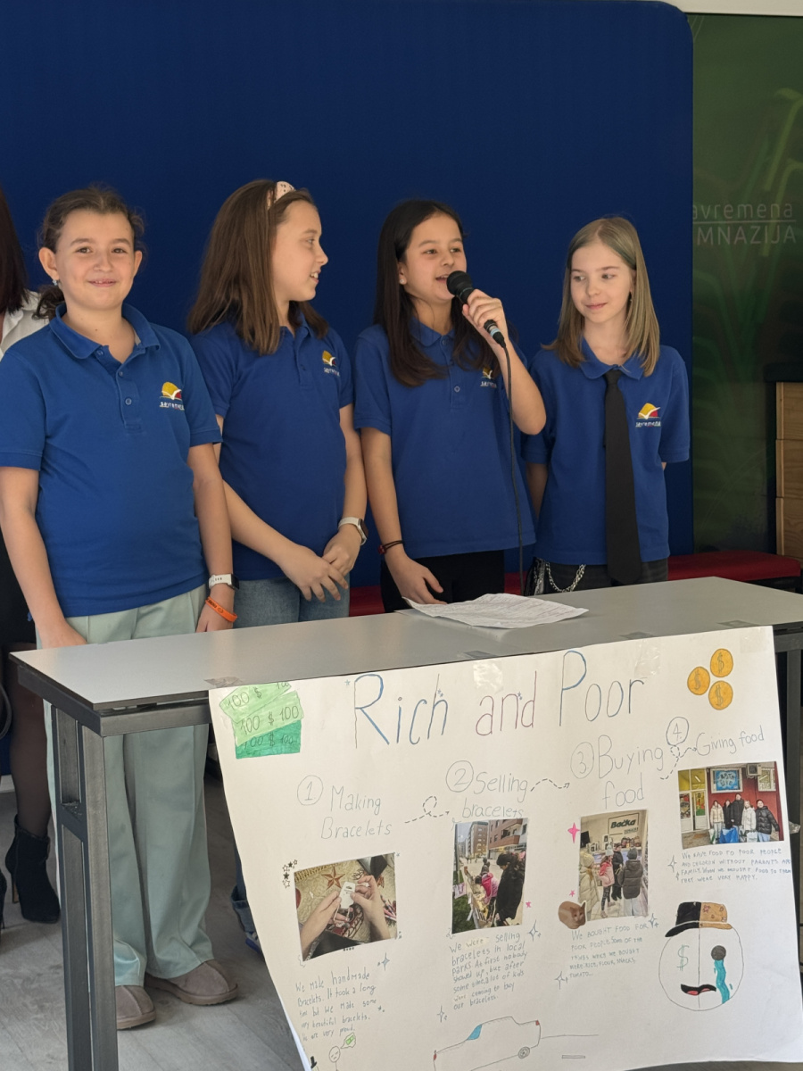 Rich and Poor teams (Eva, Elena, Lucija, Dragana) addressed social justice – how society treats rich and poor, whether it’s fair, what it means to be rich. One team made a video showing how people are treated differently just because they have or don’t have money. Another team sold bracelets, collected money, bought food and water, decorated bags, added money – and distributed everything to people who really needed it. And they concluded: “Happiness is not in money, but in the heart. That should be a lesson for everyone.”