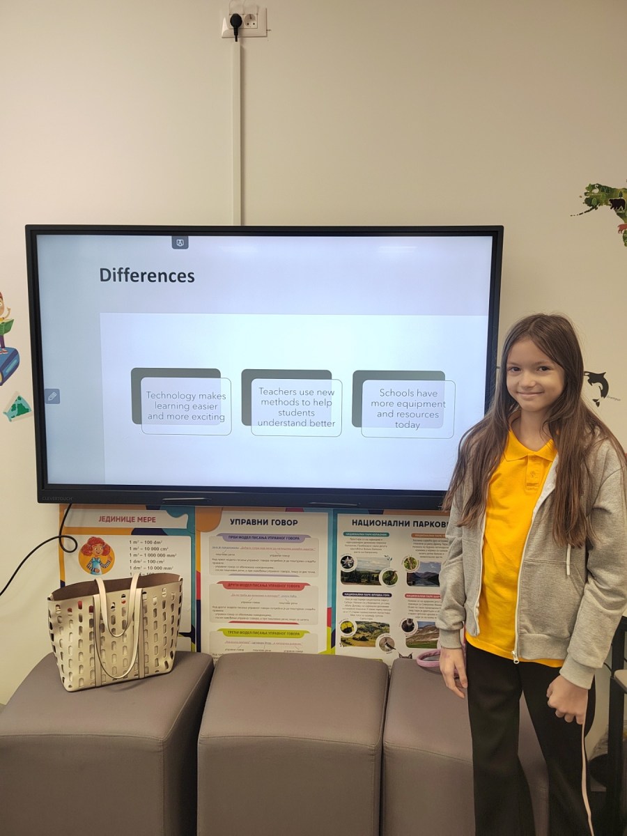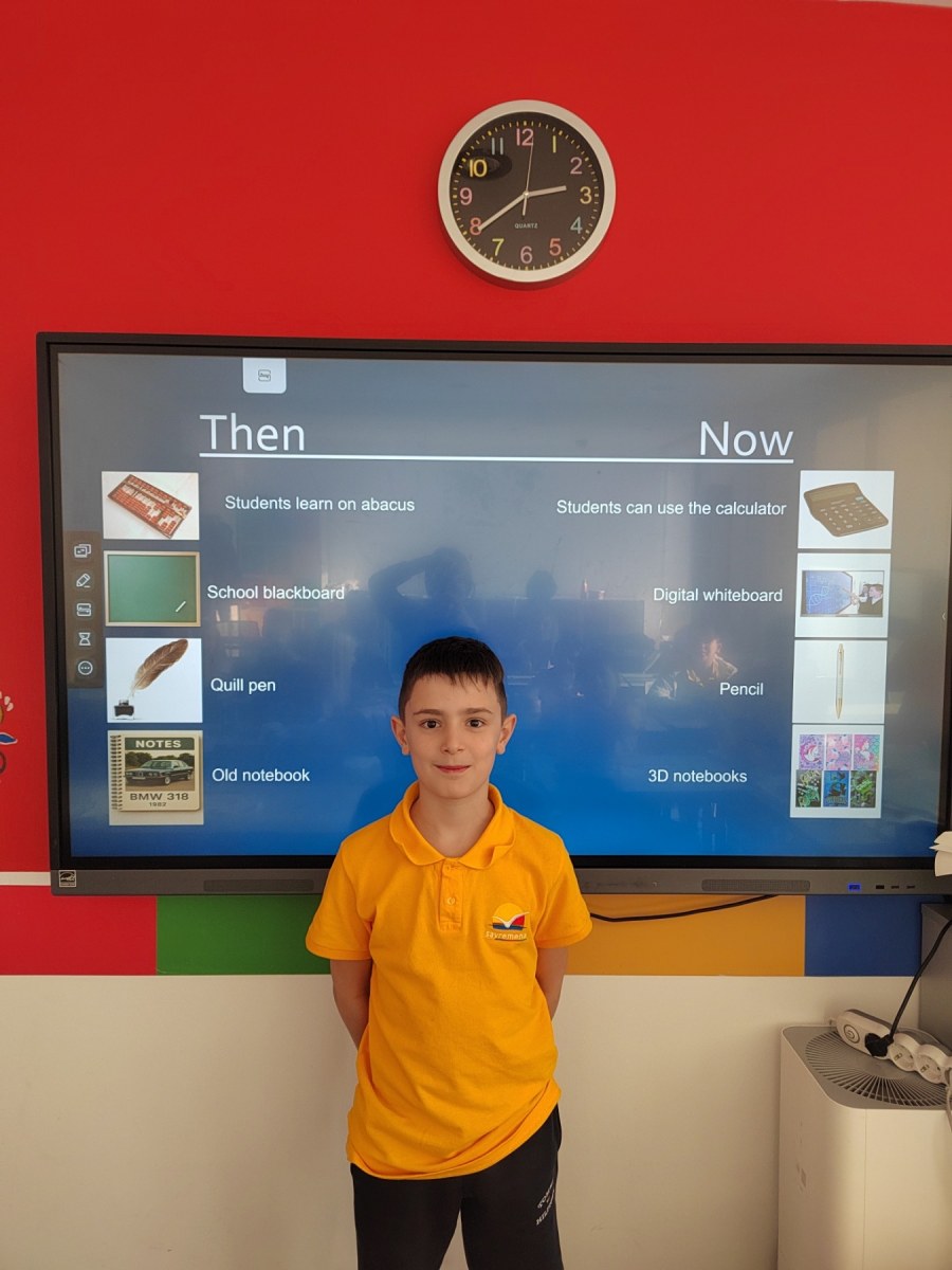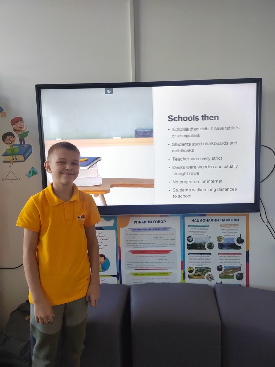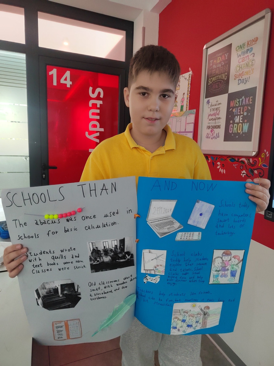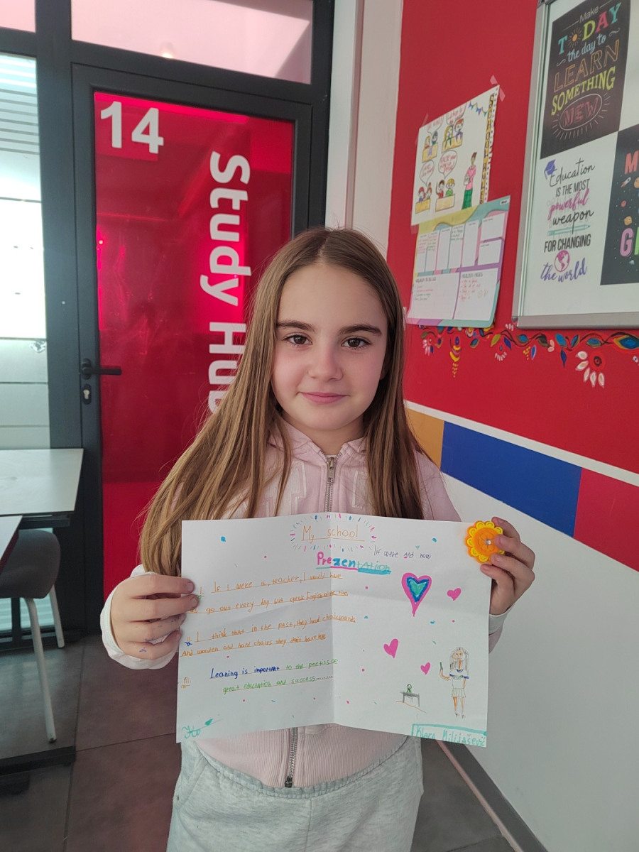The second part of the project focused on research — what were schools like in the past, and what are they like today? Students compared the two through drawings, short texts and presentations. They noticed how today’s schools are more inclusive, creative and modern, and how technology transforms the way we learn. Some spoke fondly about old classrooms with chalk and wooden desks, while others expressed how grateful they are to learn through experiments, tablets and games.