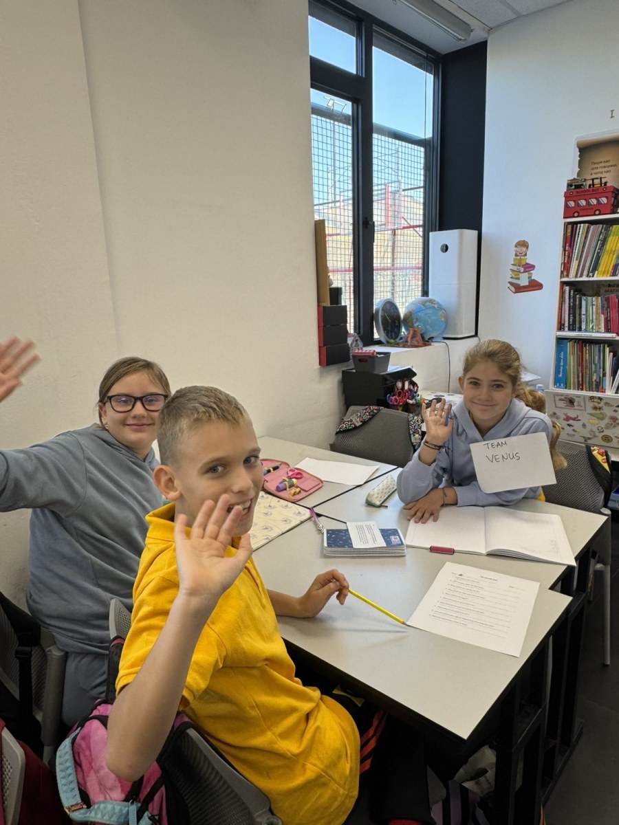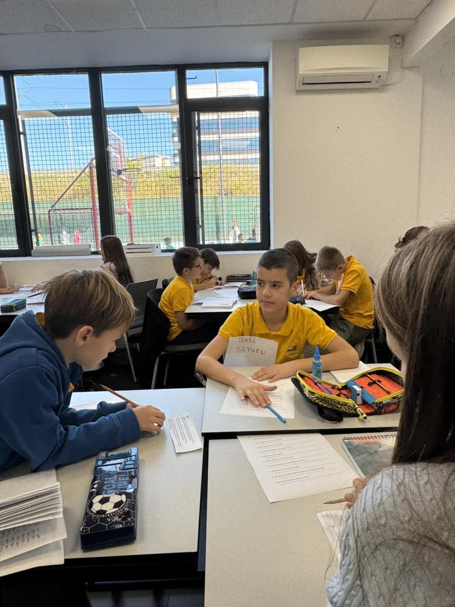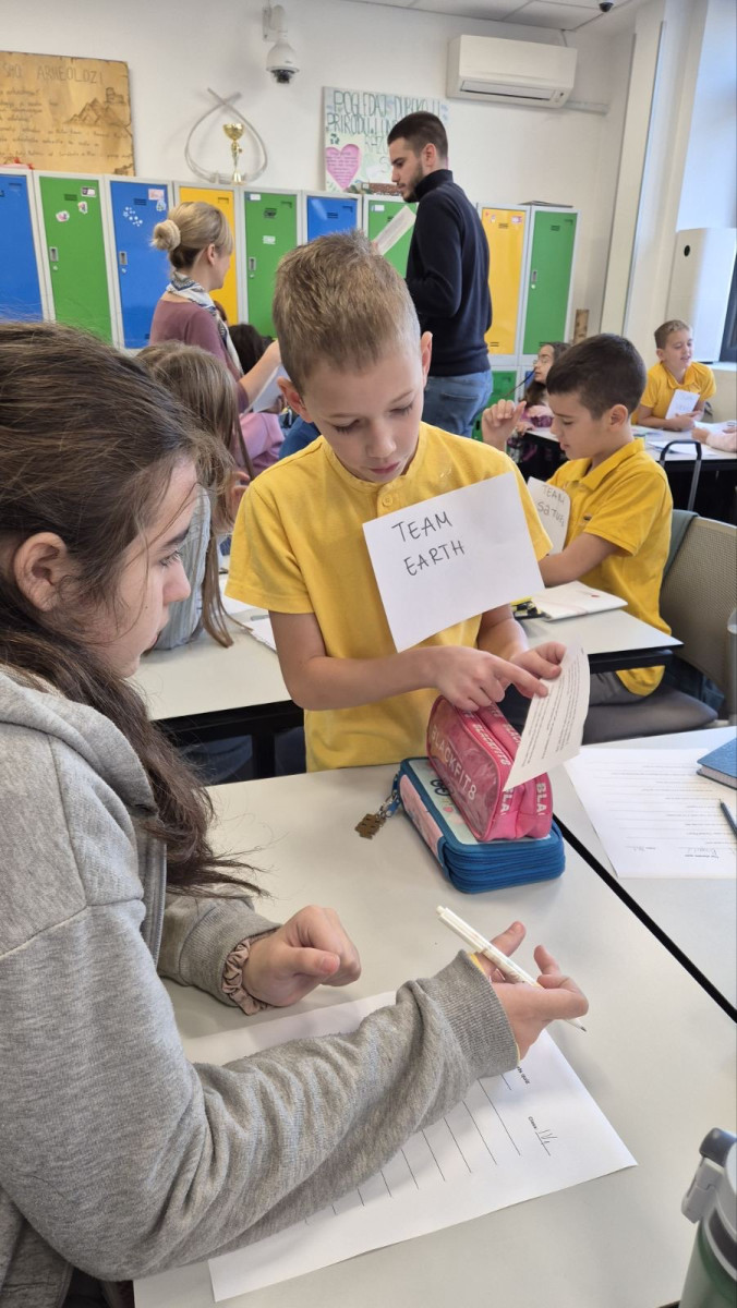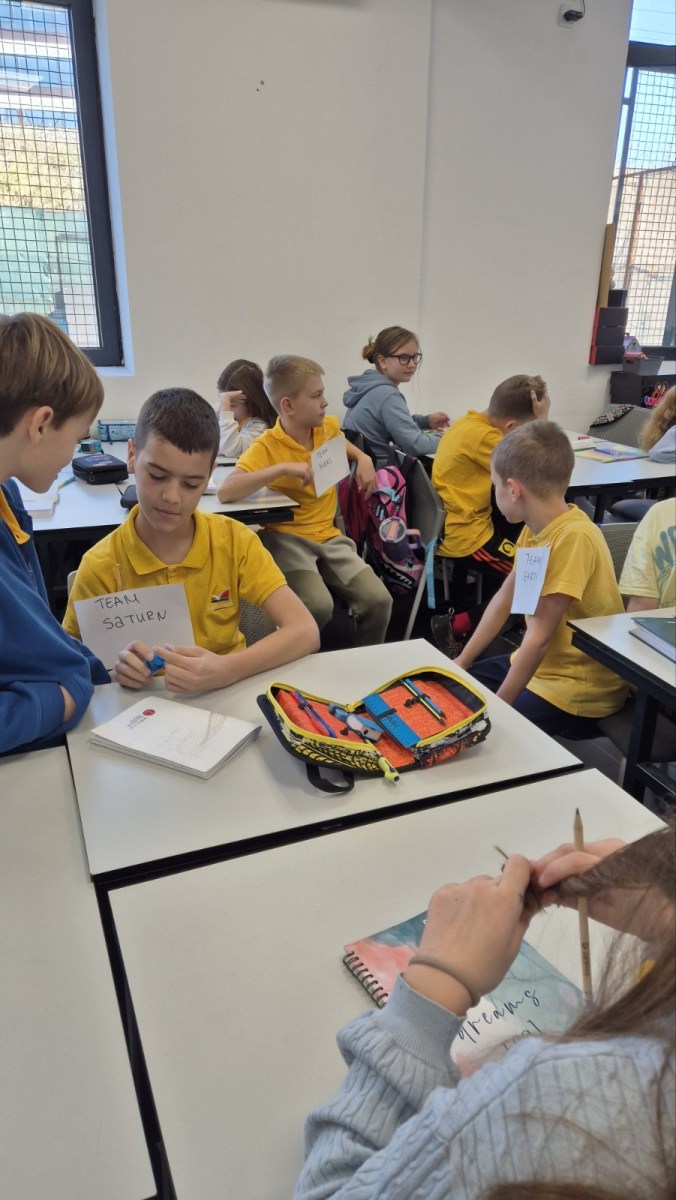 To make the class even more interactive, the students were divided into teams, with each team representing one planet of the Solar System. Labels such as “Team Earth,” “Team Saturn,” and “Team Uranus” were placed on desks, adding excitement and a sense of friendly competition.