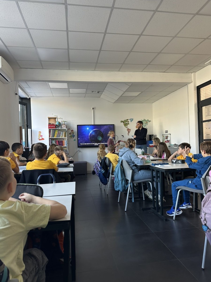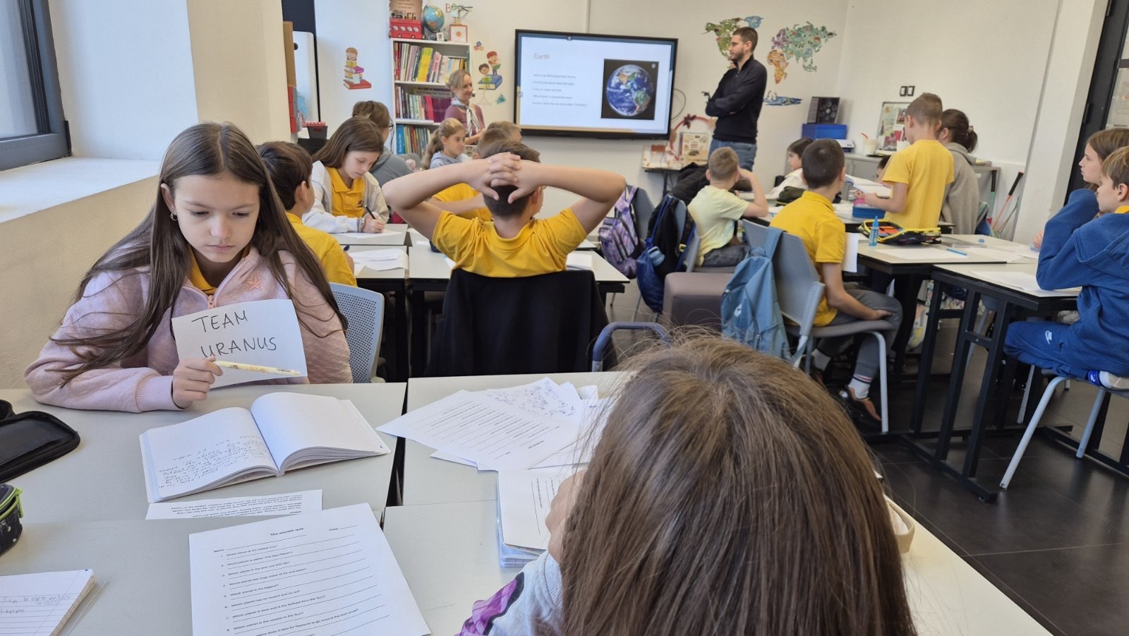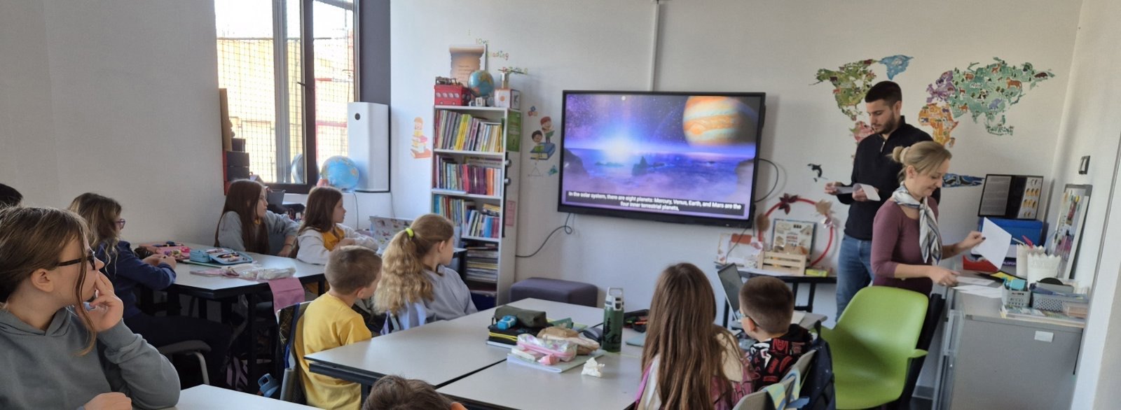 A specially designed open class led jointly by English teacher Tanja and Geography teacher Petar, centred around the theme “Our Solar System Journey.” The goal was to connect natural sciences and English in a meaningful way, allowing students to explore planets while developing language skills through real content.