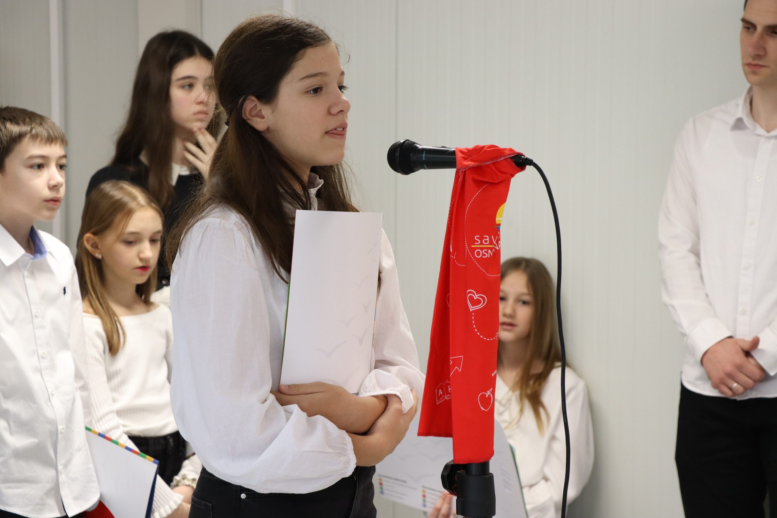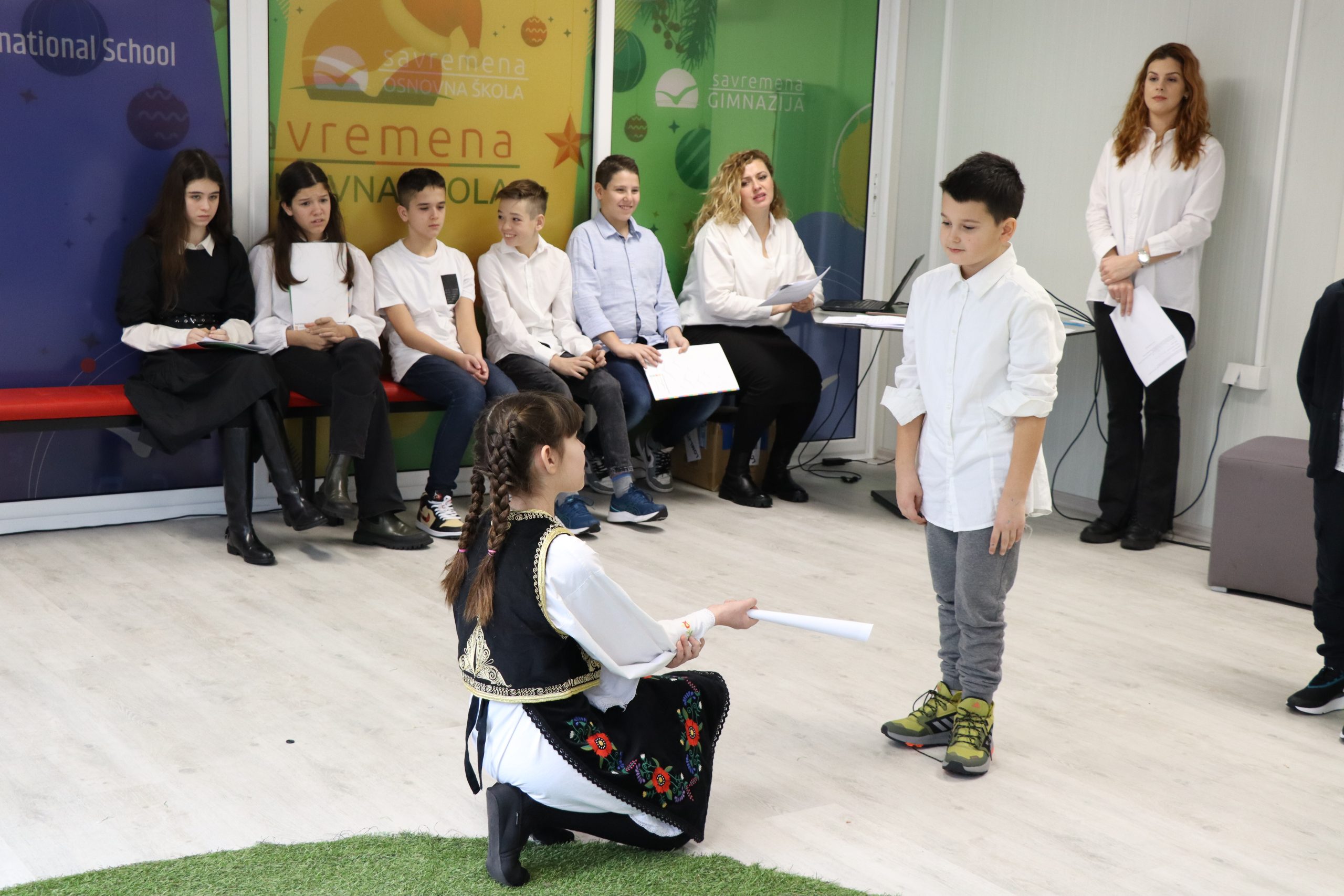 Among the older students, some particularly stood out – Ema Nikolić, who recited verses by Vojislav Ilić, followed by Rastko Nešovanović, Uroš Đukić and Vuk Nedimović who recited verses by Matija Bećković, our well-known academician. Seventh-grade student Aleksandra Mamuzić also contributed to the overall atmosphere with her charm and talent for reciting poetry. The programme included fifth-grade students as well, who presented an excerpt from Mihajlo Pupin’s biography, “From a pasture to a scientist”, which talked about Pupin’s experience of St. Sava celebrations in his hometown Idvor.